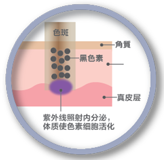 紫外线的照射,刺激黑色素细胞,使黑色素转移至皮肤表面,形成可见的色斑
