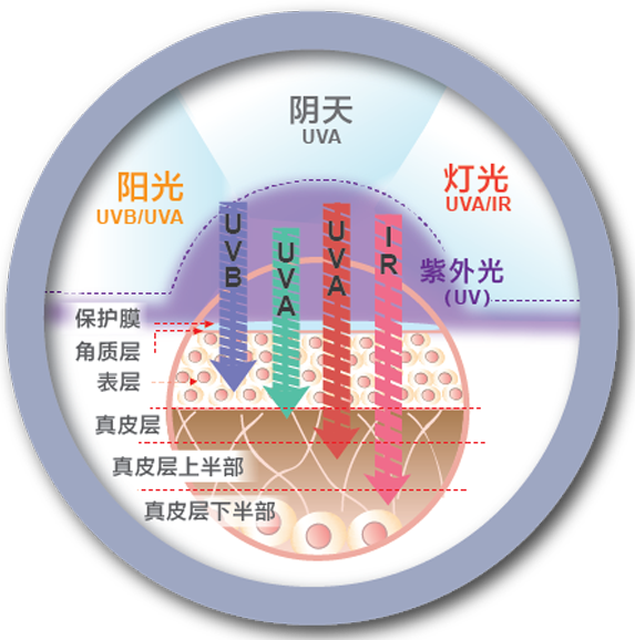 UVA与UVB的不同波长,深入到肌肤的各个层面,可刺激真皮层下半部的黑色素。